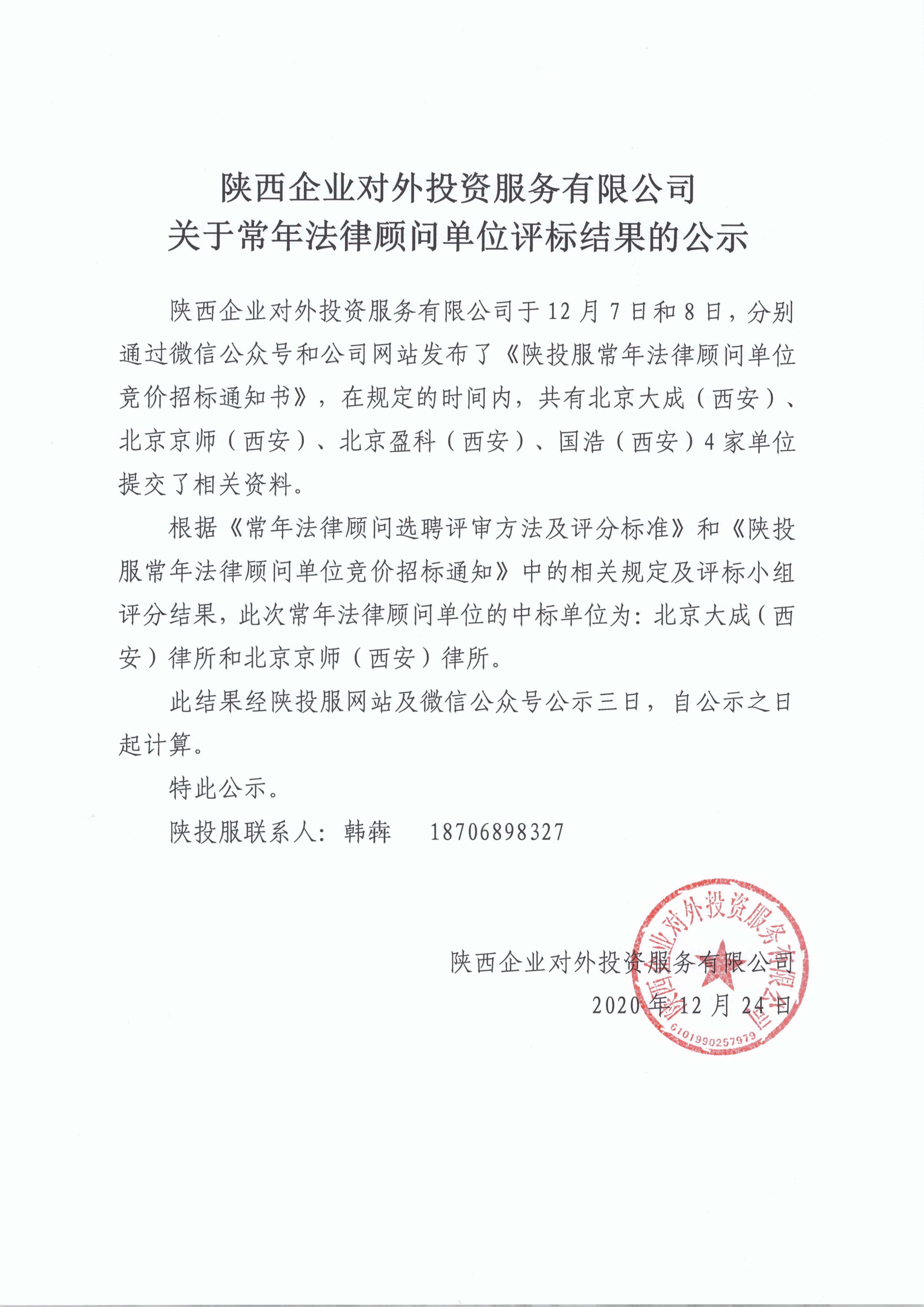 陕投服常年法律顾问单位评标结果公示