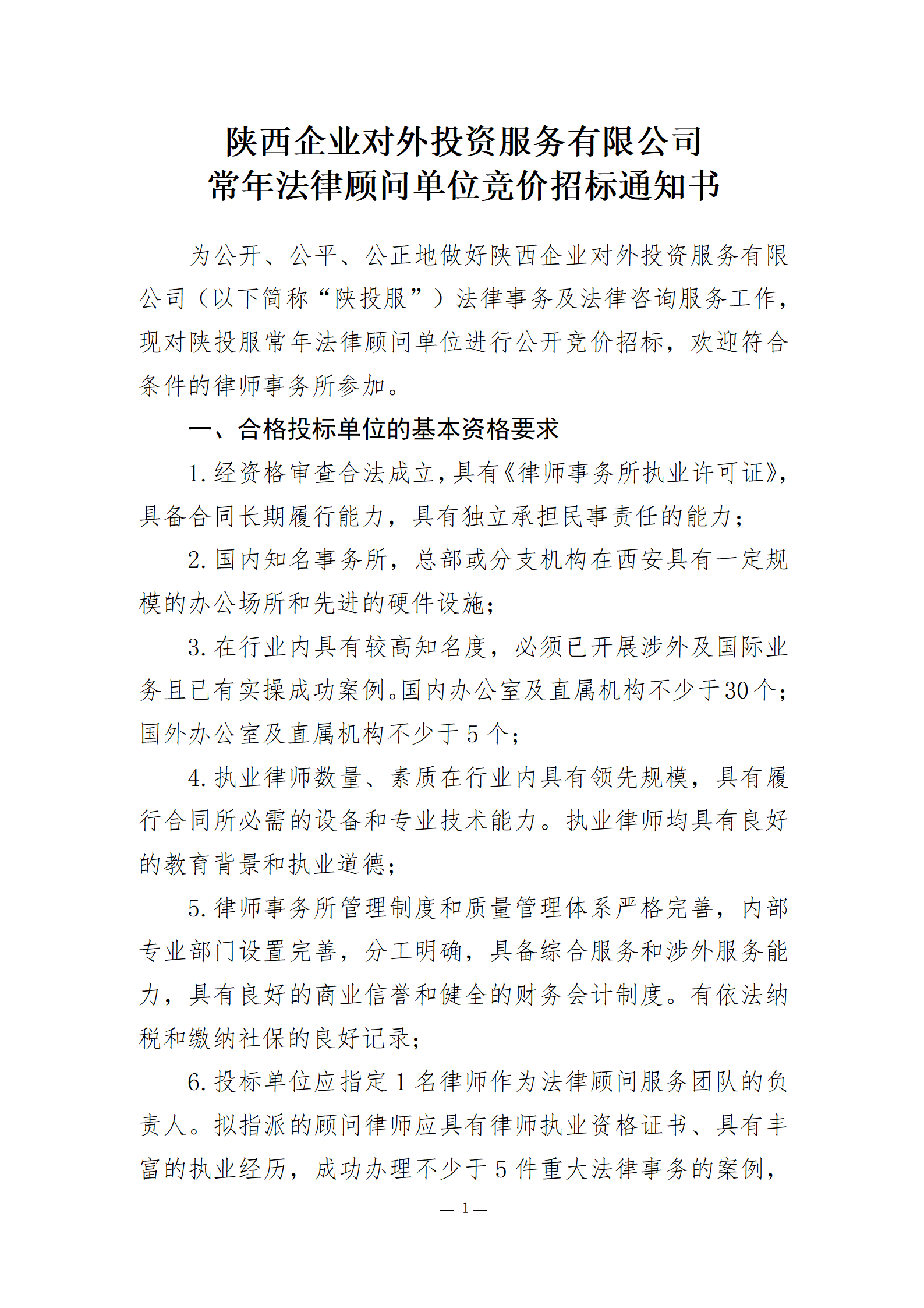 附件:陕投服常年法律顾问单位竞价招标通知书