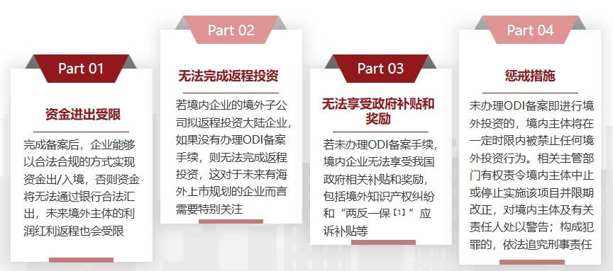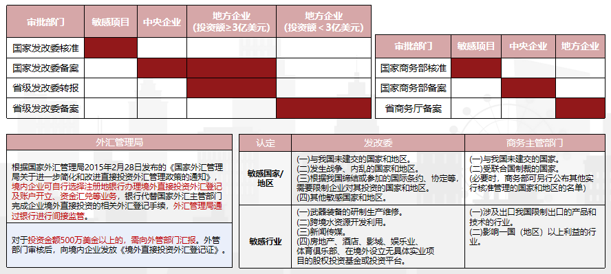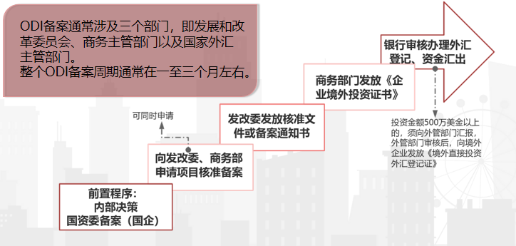 境内企业开展境外投资应当履行境外投资项目备案手续,若涉及敏感国家和地区、敏感行业的,则实行核准管理;该手续由发改委、商务主管部门、外汇主管部门三个部门牵头审核,并颁发相应核准/备案文件,实践中将上述手续流程称为ODI备案。境内企业实施境外投资行为需进行ODI申报,并获得相应证书。